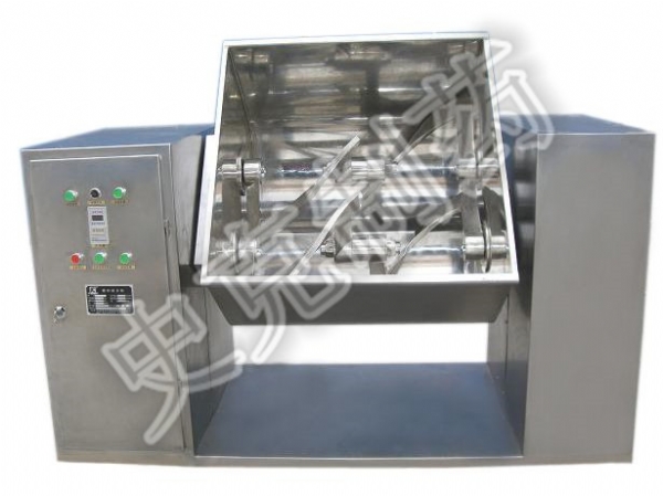 槽型混合機通過機械傳動,使S式攪拌漿旋轉,推動物料往復翻動,均勻混合,槽型混合機操作時采用電氣控制,可設定混合時間,到時自動停機,從而提高每批物料的混合質量。
